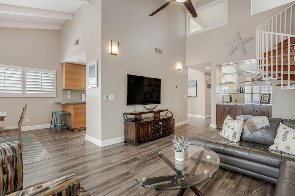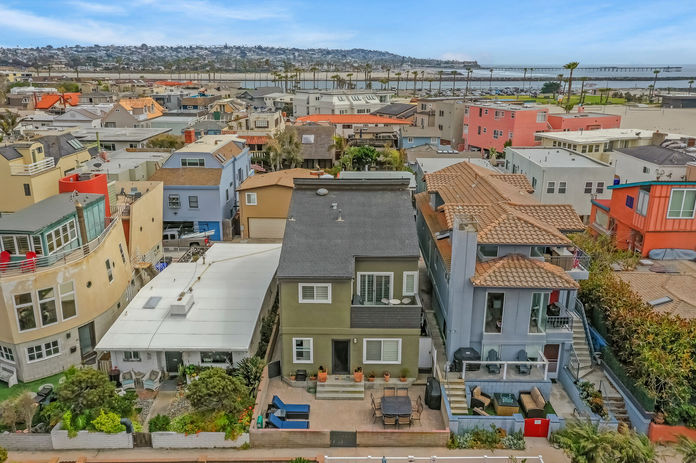 Meticulously renovated and lovingly maintained duplex (2 units: 3BR/2.5BA and 3BR/2BA) only 4 homes from the inviting sands of South Mission Beach on a highly desirable court! Upstairs (723) features 3 bedrooms, 2.5 baths and approx. 1,580sf of living space with the main living area, 2 beds and 2 baths on the entry level, and a loft-style 3rd bedroom with a half bath and sizeable attic/closet/storage space upstairs. Features include 2 terraces, vaulted ceilings, teakwood spiral staircase, chef's kitchen with Thermador double ovens, 6 burner professional cooktop, built-in microwave and Viking refrigerator, soapstone counters, bamboo cabinets, wide plank flooring, custom shutters, remodeled bathrooms, and walk-in closet in the primary bedroom. New AC unit added in August 2022. Ground floor (725) is a charming single-level home featuring 2 beds, 2 baths, a bonus double twin bedroom, 2 bathrooms and approx. 1,045sf of living space with direct access to a spacious courtside patio. Features include a remodeled kitchen with tiled backsplash, countertop seating, pendant and canned lighting with stainless steel appliances, newer wood grain vinyl flooring, ceiling fans, custom shutters, and more. Building enjoys a 2-car garage, tankless water heaters, secured shared laundry area in walkway, gated storage on west side plus additional excellent storage options and an unrivaled South Mission Beach location.