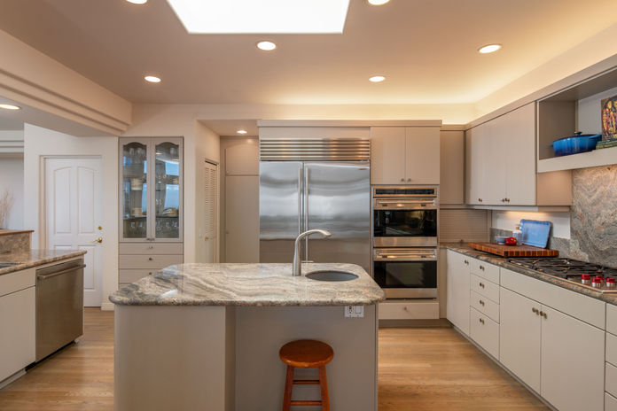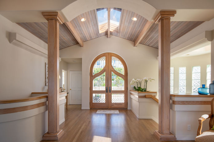 Panoramic ocean, bay, and coastline views abound from this soft-contemporary home in Los Altos Estates, a gated community of eight luxury homes on the sunny side of Mount Soledad. Captivating sunsets and azure waters are visible from almost every primary entertaining and living space in this home, and an open floor plan with an expansive wrap-around terrace seamlessly integrates living, dining, and cooking on the entry level.